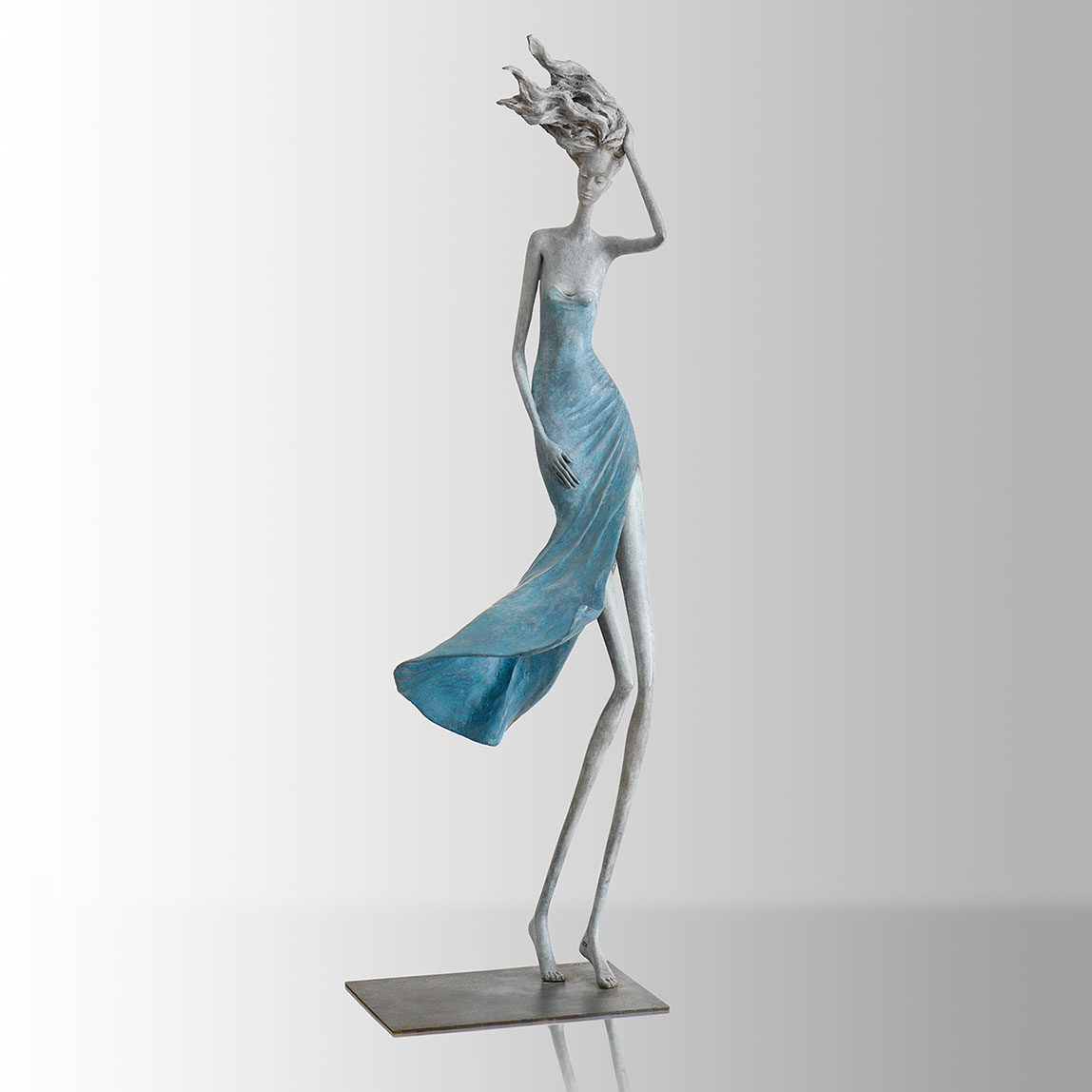 Les femmes d’Hedwige Leroux retiennent immédiatement l’attention par leur élégance. Longues et élancées, elles séduisent par leur finesse et leur chevelure élaborée qu’un coup de vent soudain emporte. La femme éternelle, surgie d’un monde onirique et qui impose sa présence délicate.