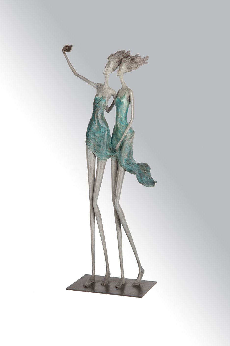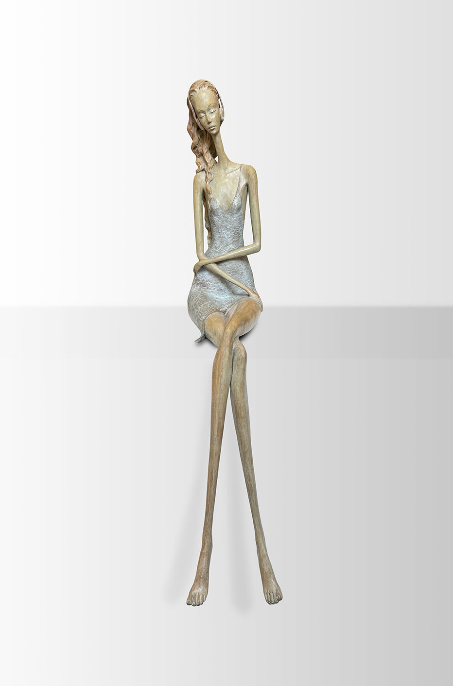 Les femmes d’Hedwige Leroux retiennent immédiatement l’attention par leur élégance. Longues et élancées, elles séduisent par leur finesse et leur chevelure élaborée qu’un coup de vent soudain emporte. La femme éternelle, surgie d’un monde onirique et qui impose sa présence délicate.