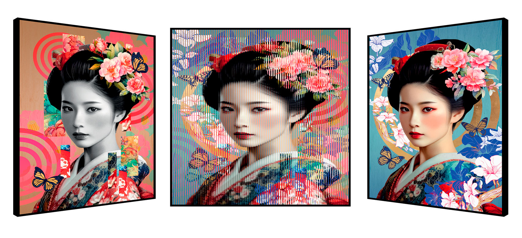 Le principe du Triple réside dans trois images, une centrale et deux latérales. Les vues latérales sont créées par des lamelles insérées à la perpendiculaire de l’image centrale. Elles offrent deux images distinctes, de part et d’autre, à 45°. Cette technique permet des variations des perceptions dans le mouvement, et assure une vision évidente de l’image centrale.